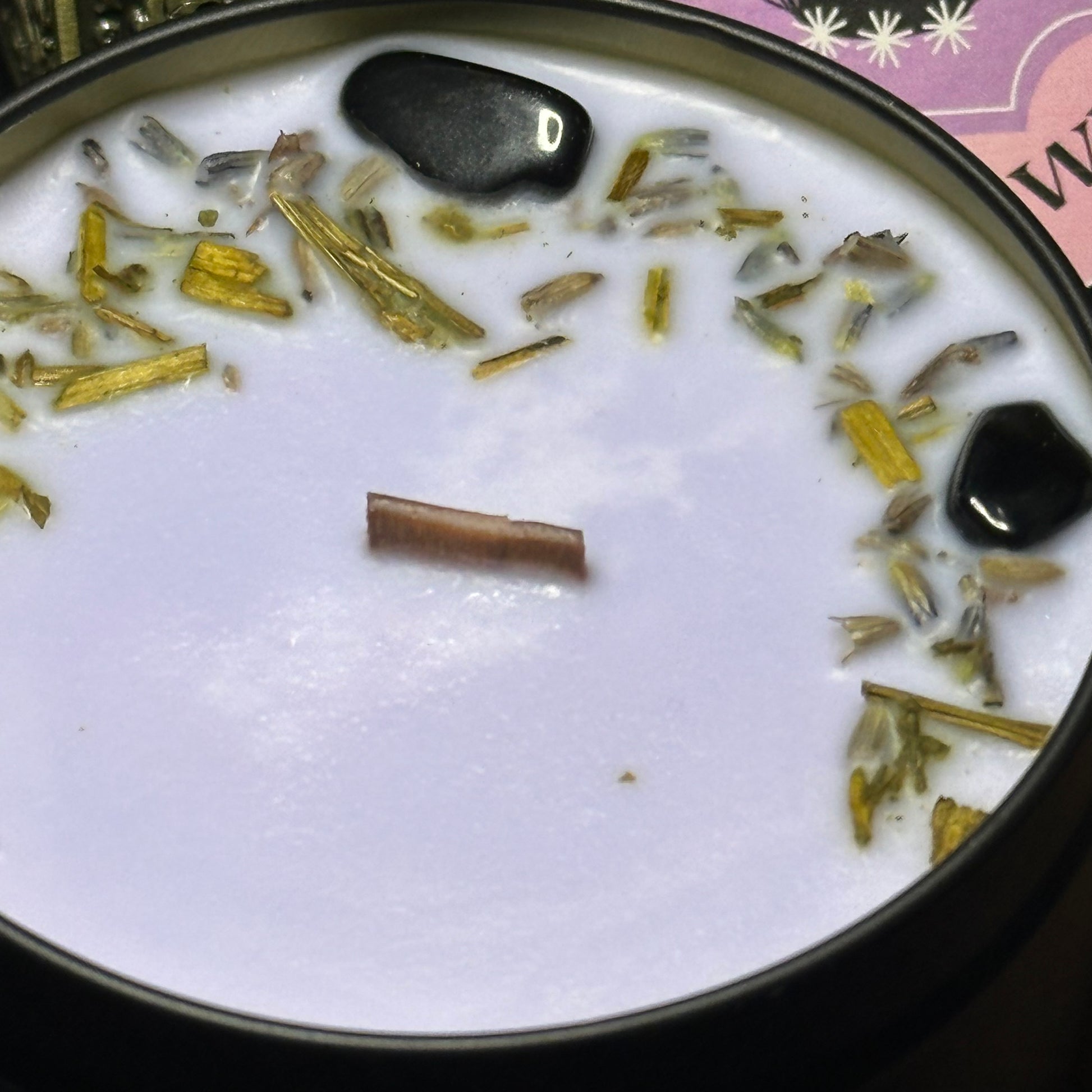 Each candle is finished with obsidian crystals for protection, dried mugwort to enhance intuition, and dried lavender for calm and purification — a sacred blend to help you connect with your inner power.